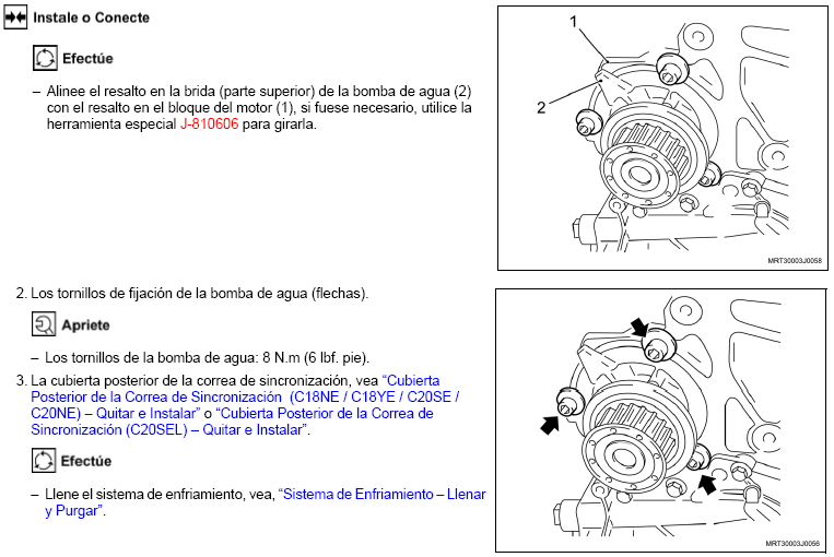 Importante: las marcas de la polea del árbol de levas y la cubierta trasera deben quedar alineadas. La marca en la cubierta inferior debe alinear con la marca en la polea del cigüeñal.