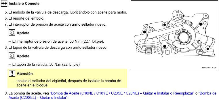 Apriete el switch de presión de aceite a la bomba de aceite a 30 N•m (22 lb pie).